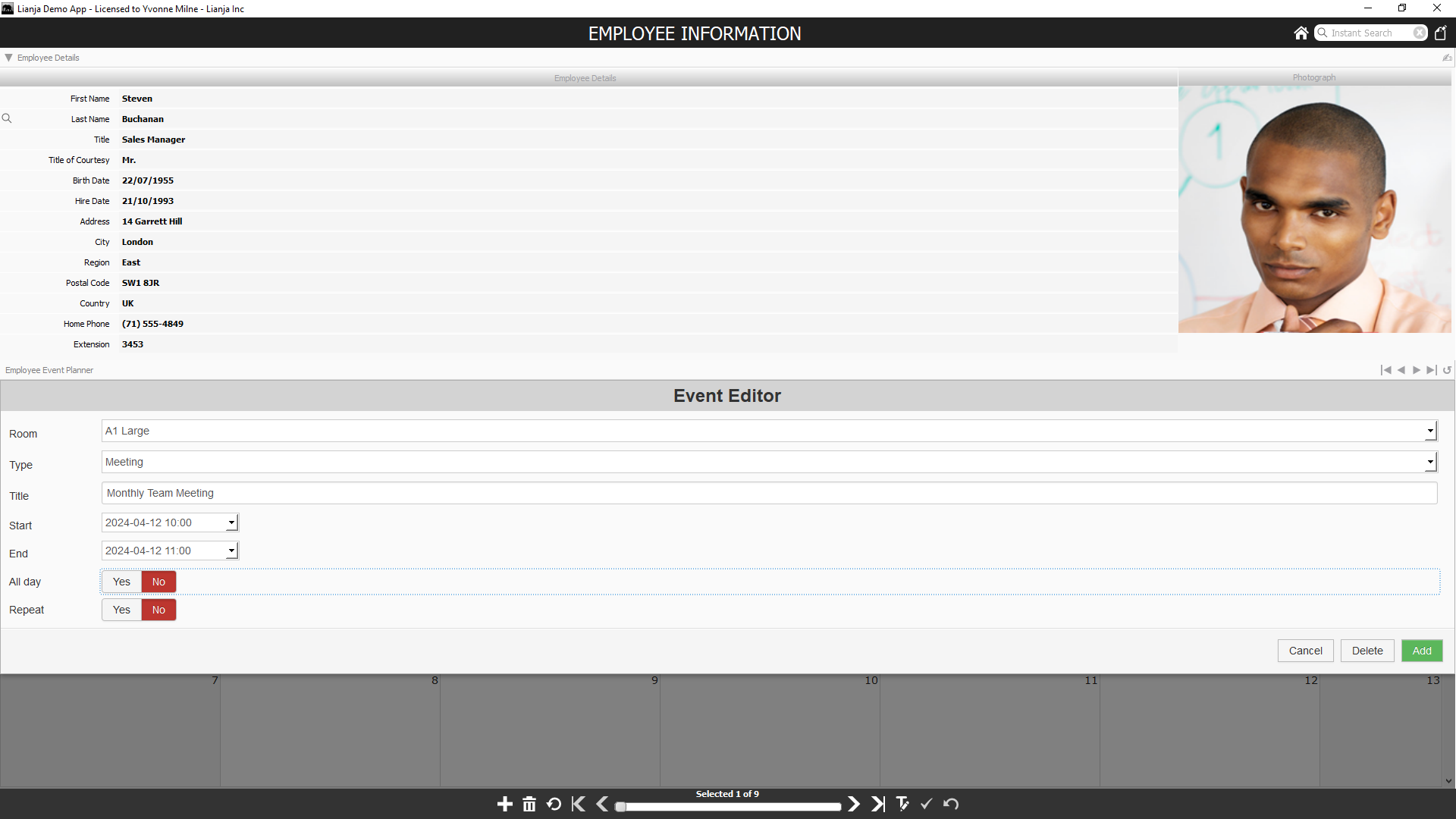 On the Lianja Mobile Client, the event detail controls are displayed in an overlay along with the buttons for Cancel, Delete and Add or Update, depending on the operation.