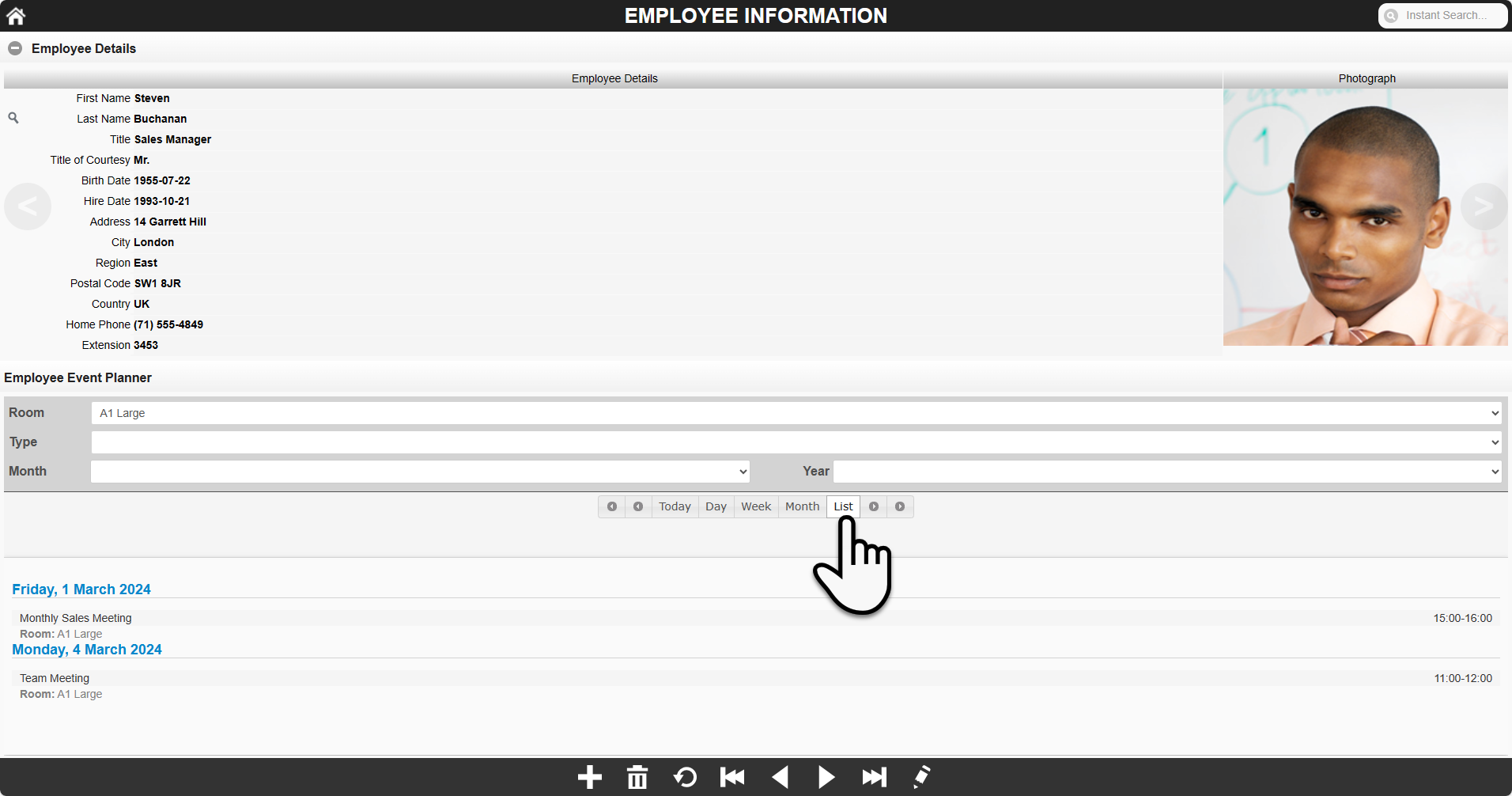 Delete Deletes the event currently displayed in the controls.