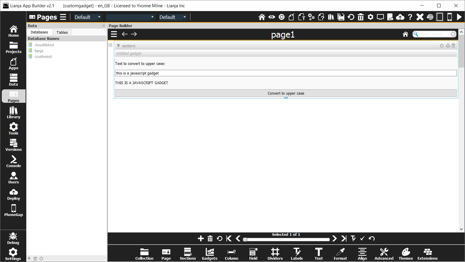 You use Visual FoxPro, JavaScript, Python or PHP with the Lianja UI Framework to build Custom Sections and Custom Gadgets. All Lianja UI Framework Classes provide integrated data binding to the underlying Lianja embedded database (the Controlsource property).
