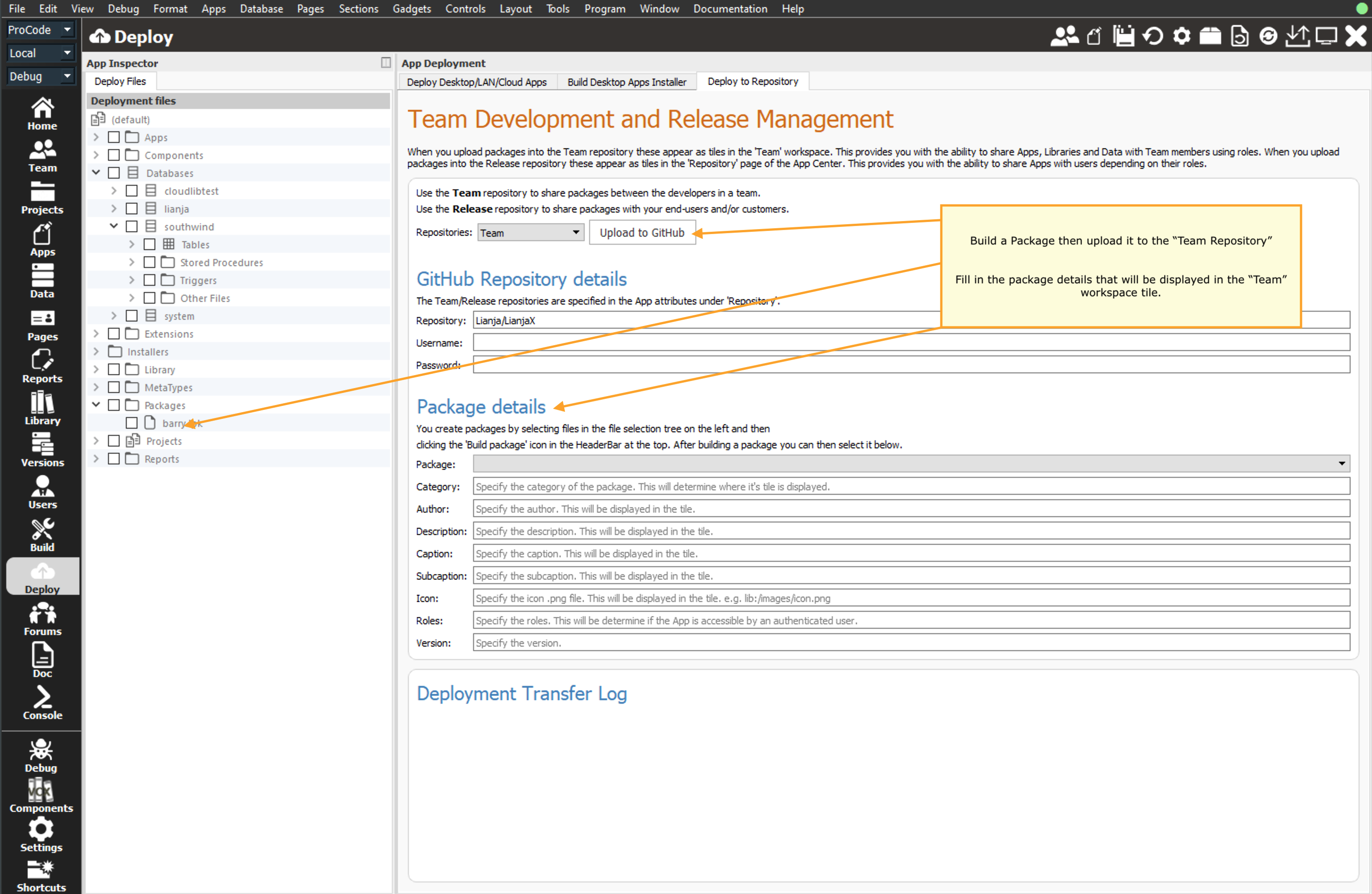 Team members can package up components into Lianja packages and them upload these to the Team Repo in the Deploy workspace.