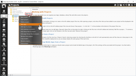Create a new Mobile App by right-clicking in the Projects panel and selecting "New App...".