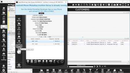 You can iterate your development in the Lianja App Builder and click the Refresh icon in the Phone App View at any time to update the App running in the Live View on your mobile device. You can change the operating system type at any time in the Phone App View or the Tablet App View by selecting it from the ComboBox at the top of the view. This will cause the PhoneGap App to be dynamically re-generated and the PhoneGap Live View Server to be restarted automatically.