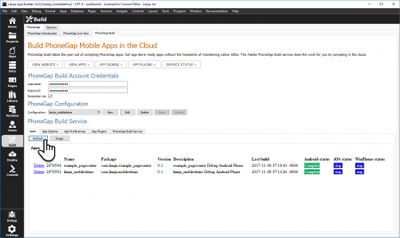 Select the Build workspace in the App Builder then select the PhoneGap Build Tab and specify the build settings as described. Notice that you can manage existing builds by specifying your PhoneGap Build Account Credentials then clicking the Refresh button. The status of your existing builds will be displayed. The Adobe PhoneGap Build Service limits you to 25 builds. You need to delete older builds or the builds will eventually be rejected. You can delete individual older builds by clicking Delete on the left hand side column of the build information or click the Purge button to delete all your builds.