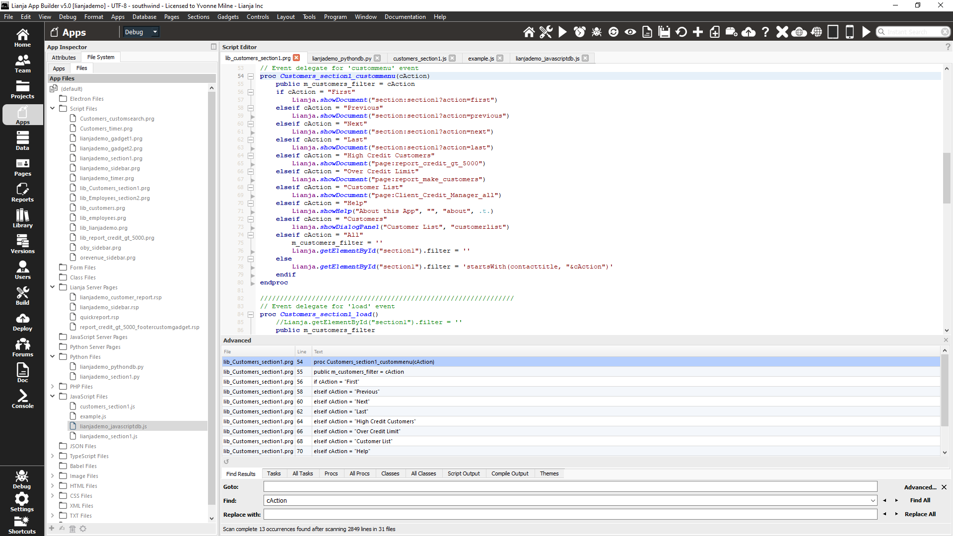 | Open file in Debugger | Opens the file currently selected in the Script Editor in the appropriate Debugger. This applies to Lianja/VFP prg scripts, Python Files and JavaScript Files |