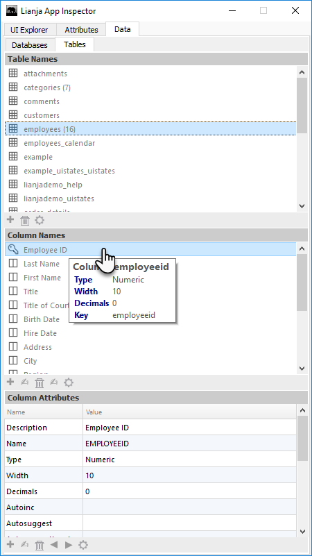 The middle panel in the Names tab displays the columns from the currently selected table. Double-click on a column name to open it in the Table Designer ('Modify a Column' dialog prior to v6.3) so you can modify its definition and/or attributes.