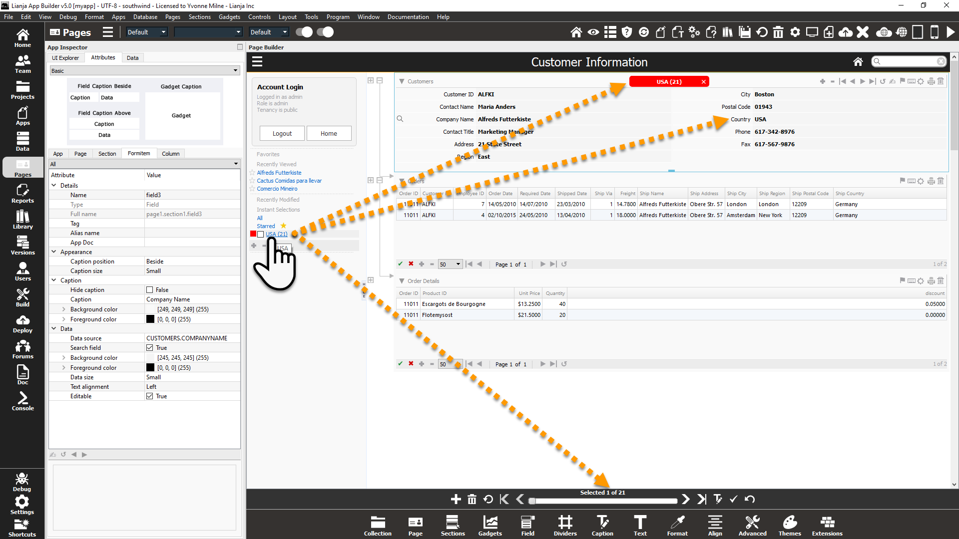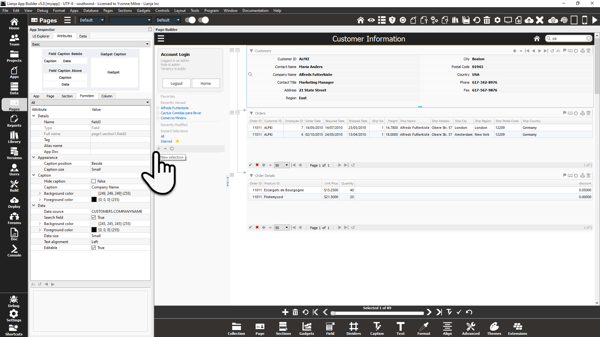 To do this, click on the caption of the field that you want to use (Company Name here) and it will be selected in the App Inspector.