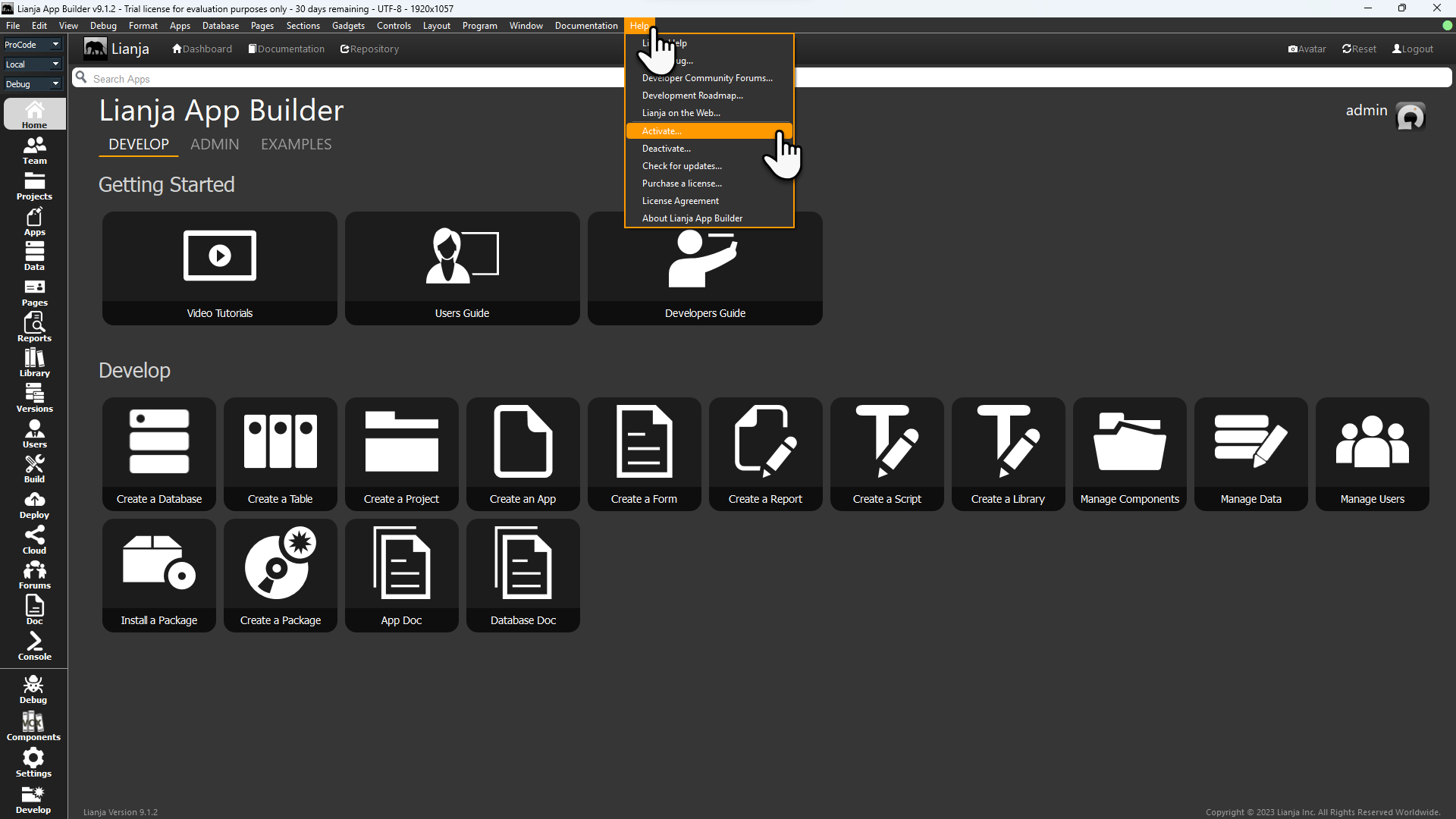 Licenses for Lianja App Builder are activated and deactivated from the System Menu in Lianja App Builder.