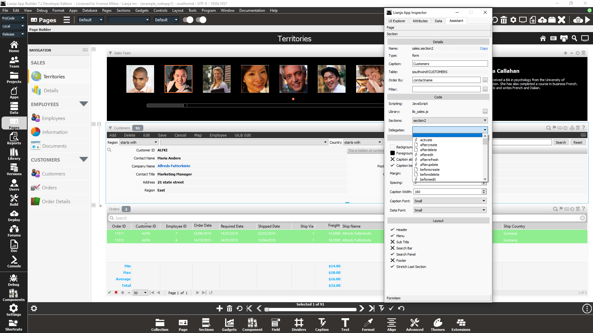 The Page Builder Assistant can assist you in designing the UI and coding delegates in Pages. It provides speedy access to key Page, Section, Formitem and GridColumn attributes and the ability to navigate quickly between the UI elements. Delegates can be edited in a floating editor directly in the Pages workspace.