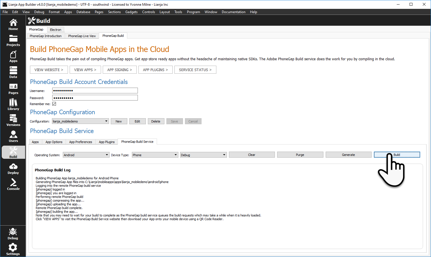 Note: PhoneGap Build of Lianja Apps was deprecated in Lianja v5.4.